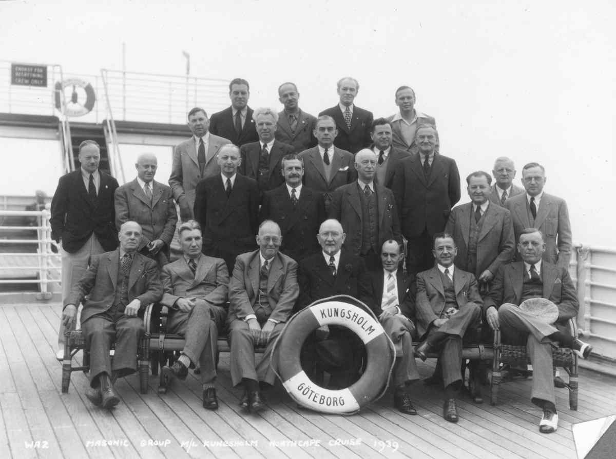 This picture was taken around July 9, 1939, on the Kungsholm ship cruise to the arctic circle, specifically the sixty-sixth degree (Upper Circle). The writing on the bottom says WA2 MASONIC GROUP M/L KUNGSHOLM NORTHCAPE CRUISE 1939.