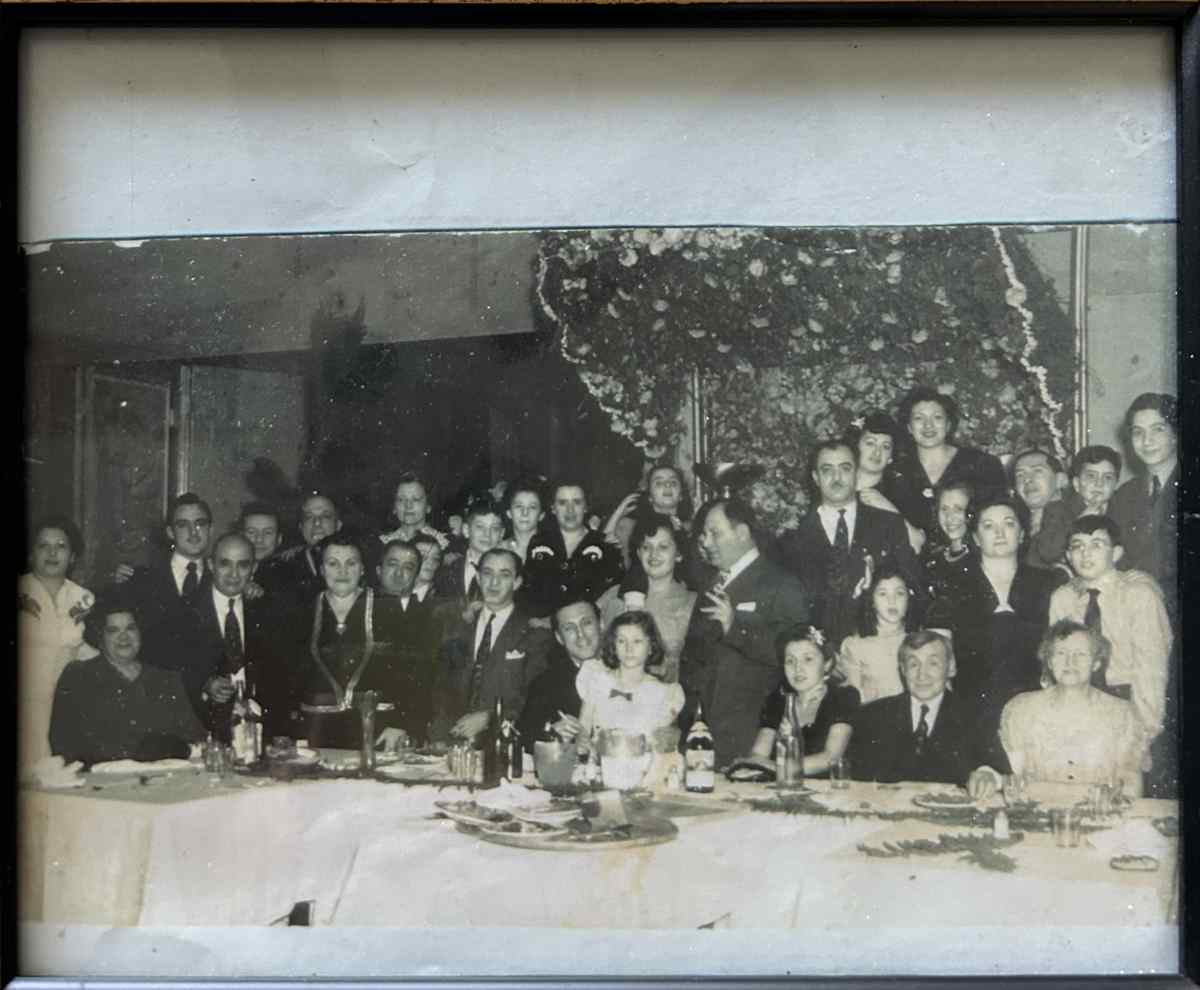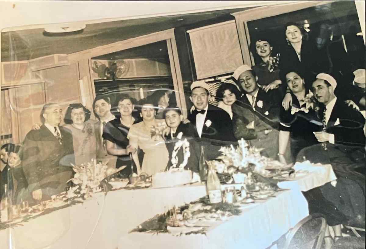 From left, standing: _____, ____, David Shafran, Fay Shafran, Sadie Stone, Stanley Stone, Peter Stone, Joyce Stone, Louis Lonstein, Hennie Shafran, Max Shafran. top right corner, from left: Renee and ____
