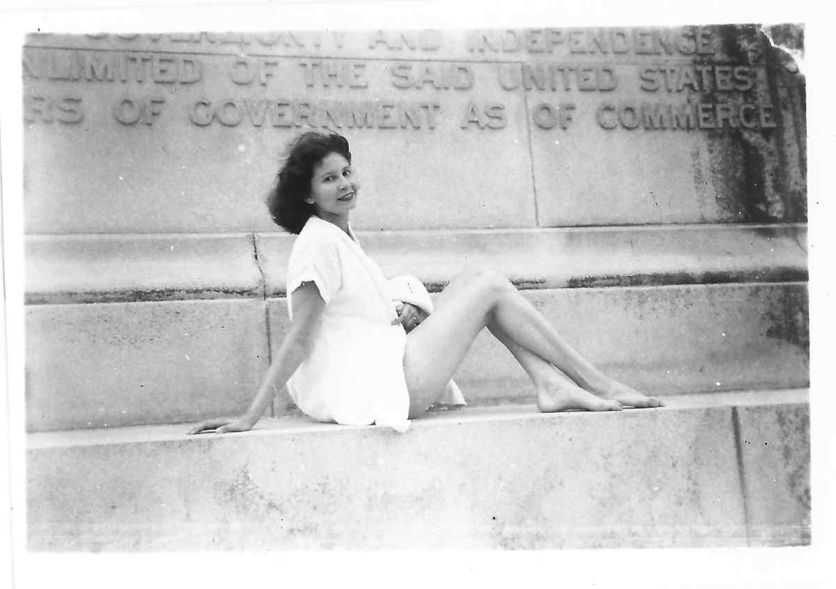Marjorie in front of a house, dressed to kill, April 23, 1942
