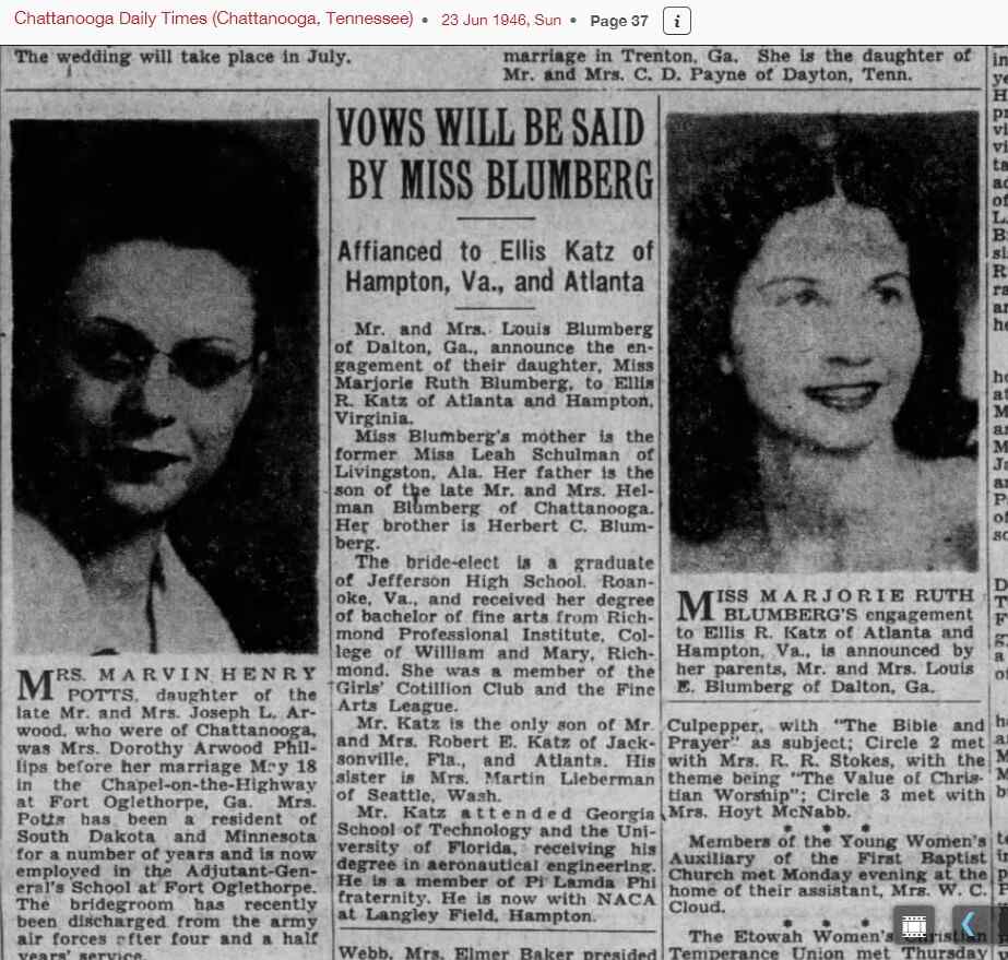 Marjorie Ruth Blumberg was born 3 Feb 1925 in Chattanooga, TN. Right off the bat, you may note, she was eager to perform. She was the daughter of Leah and Louis Blumberg and the sister of two-year older Herbert. The family lived, for a time on Missionary Ridge in Chattanooga, the scene of fierce fighting during the War Between The States.