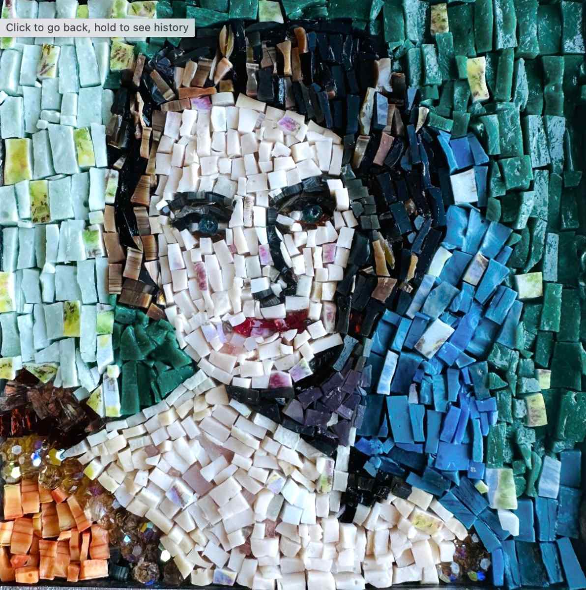 Austin Mosaic Guild member Lee Bertiger created this wonderful mosaic portrait of her grandmother, Alice Blumberg Epstein- 4” x 4” ,smalti, stained glass, crystal beads, and a vintage tea cup saucer.