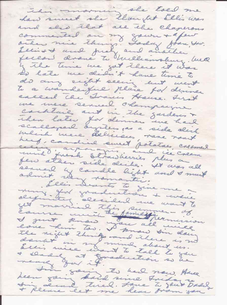 Irv and Les and Ellis hit it right off this weekend especially Irv & Ellis. Cotillion dance was very nice & Joan & I got orchids from the boys. At the dance Ellis went over & spoke to Mrs Chaeney & asked her to dance etc & naturally she went for him right away. First thing this morning she told me how sweet she thought Ellis was and also that all the chaperones commented on my gown & a few other nice things. Today Joan, Irv Ellis & I and Judy and another friend drove to Williamsburg. Well by the time we got there it was so late we didn't have time to do any sight seeing but went to a wonderful place for dinner called The Travis House. First we were served champagne cocktails out in the gardens & then later for dinner we had scalloped oysters as a side dish which were delicious, rare roast beef, candied sweet potatoes, creamed celery, asparagus, and ice cream with fresh strawberries plus a few other side dishes. It was all served by candle light and I must admit very romantic.